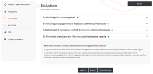 Nella sezione Esclusione visualizza i Motivi di esclusione stabiliti dall'articolo 57, paragrafi 1 e 2, della direttiva 2014/24/UE: