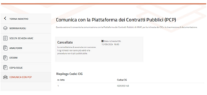Il RUP seleziona COMUNICA CON PCP e visualizza la tabella di riepilogo con i codici CIG richiesti in fase di pubblicazione e la tabella con le Schede ANAC utilizzate.