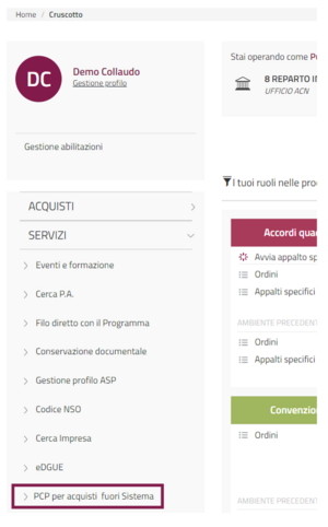 Una volta selezionato PCP PER ACQUISTI FUORI SISTEMA visualizzi il disclaimer che ti informa che l'accesso al servizio è riservato esclusivamente alle Amministrazioni Pubbliche autorizzate.