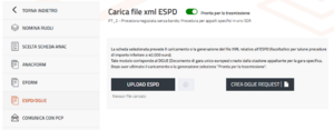 - se sei già in possesso del file, puoi procedere al caricamento selezionando UPLOAD ESPD. Carica il file .xml, SALVA i dati e seleziona PRONTA PER LA TRASMISSIONE