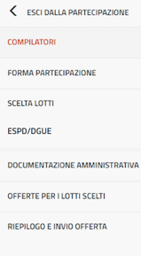 Il menu laterale che trovi sul lato sinistro della schermata ti accompagna in tutte le fasi della partecipazione alla gara. Attraverso questo menu accedi direttamente alle varie sezioni, come ad esempio: Compilatori, Forma di partecipazione, Scelta dei lotti, Documentazione amministrativa, Offerte per i lotti selezionati, Riepilogo e invio dell’offerta, ecc-