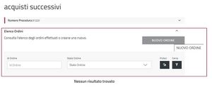- Box informazioni Stato dell’Ordine: il box descrive lo stato di avanzamento della procedura, con il relativo numero; date e limiti per un corretto svolgimento della procedura.