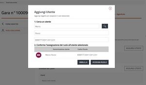 Seleziona AGGIUNGI UTENTE per indicare l’utente a cui assegnare i ruoli, cercandolo per Nome, Cognome e Codice fiscale. Ricorda che l’utente a cui vuoi assegnare il ruolo di Direttore deve essere registrato sulla piattaforma Acquisti in Rete.
