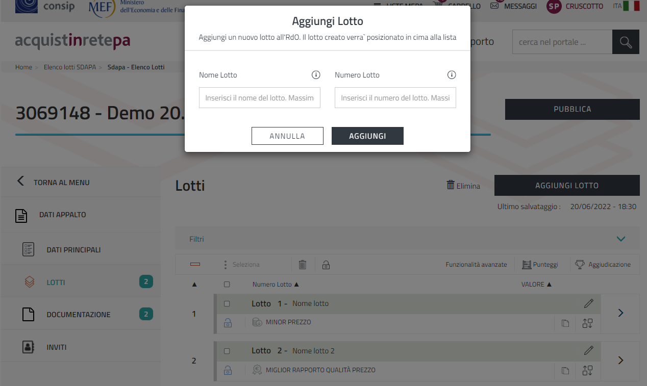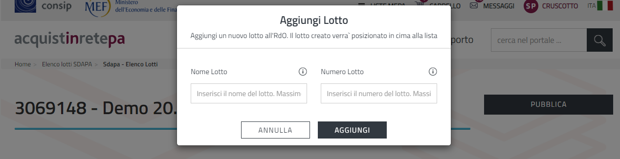 Versione del 11 nov 2025 alle 11:32 di Acquisti in Rete 16 (discussione | contributi) (Acquisti in Rete 16 ha caricato una nuova versione di File:17. Dettaglio Aggiungi Lotto.png.)